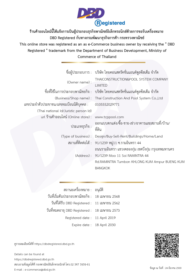 บริษัท ไทยคอนสตรัคชั่นแอนด์พูลซีสเต็ม จำกัด (THAICONPOOL) เป็นผู้ดำเนินการออกแบบ และก่อสร้าง (Design and Construction) สระว่ายน้ำ รวมถึงผลิต จำหน่าย และนำเข้าอุปกรณ์สระว่ายน้ำทุกชนิด